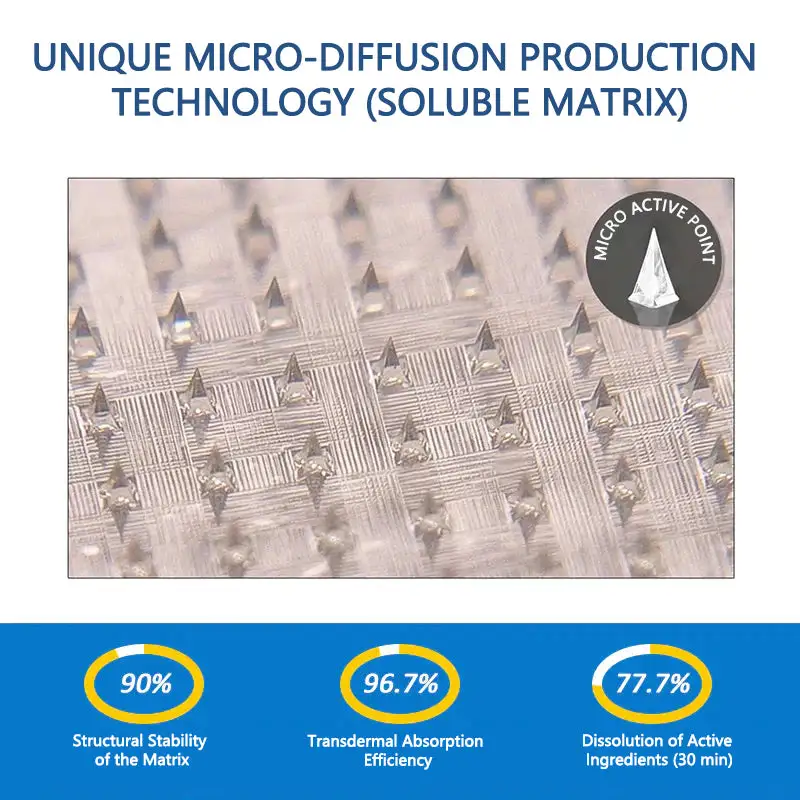 Precision-Engineered for Comfort and Efficacy “Each micro-point measures just 0.27 mm in lengthโmerely 1/7th the thickness of a human hairโand is crafted from soluble active hydrogel. These points are precision-manufactured using state-of-the-art techniques to guarantee a 100% painless experience, while effectively delivering potent botanical ingredients directly into the skin for maximum absorption.”